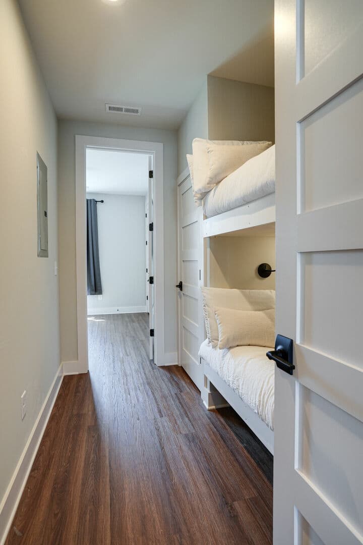 Спалнята се гордее с изискан декор и разполага с удобно двойно легло king size, което обещава спокоен нощен сън. Освен това има удобна зона за спане с две единични легла, проектирани в стил двуетажно легло, което осигурява допълнително пространство за вашето семейство или приятели да отседнат удобно.