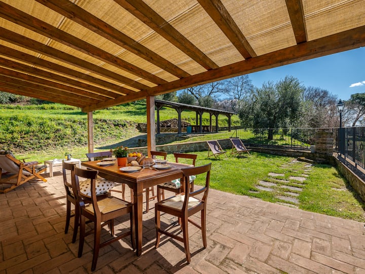 Голяма, красива, селска къща, построена през 2019 г., заобиколена от дървета и ливади. На 4 км от центъра на Скансано, на върха на хълм, на 27 км от морето, в провинцията. Частна: красива, добре поддържана градина с тераса (неоградена) с трева и цветя. Тераса (45 кв. м), градински мебели, къща за барбекю. В комплекса: пералня (за общо ползване). 350 м дълъг стръмен, тесен достъп за моторни превозни средства (по неасфалтиран път). Паркиране пред къщата. Магазин 4 км, хранителен магазин 4 км, супермаркет 4 км, ресторант 4 км, бар 4 км, термални бани „Сатурния“ 30 км. Атракции наблизо: Малиано в Тоскана 14 км, Таламоне 34 км, Монте Арджентарио 40 км, Гроссето 30 км, Питиляно 46 км. Пътечки за пешеходен туризъм: Национален парк Марема – Учелина 40 км. Обърнете внимание: препоръчва се автомобил. Бебешко оборудване при поискване (включено). Собственикът живее в същия имот. Собственикът използва някои стаи в къщата.