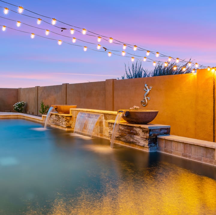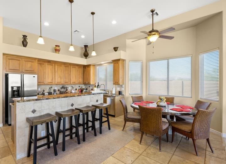 Отдайте се на спокойствие, в изискана ваканционна къща с 4 спални и 3 бани, разположена в Скотсдейл. Това светилище предлага всичко, което бихте могли да си пожелаете - от покер залата, която се отваря до много самостоятелен, но просторен заден двор с басейн . Независимо дали разглеждате близките пътеки, за да се забавлявате в голф клуб Troon North, или просто да се отпуснете край частния басейн, докато правите барбекю и се наслаждавате на залеза с приятелите и семейството си, това място има всичко!