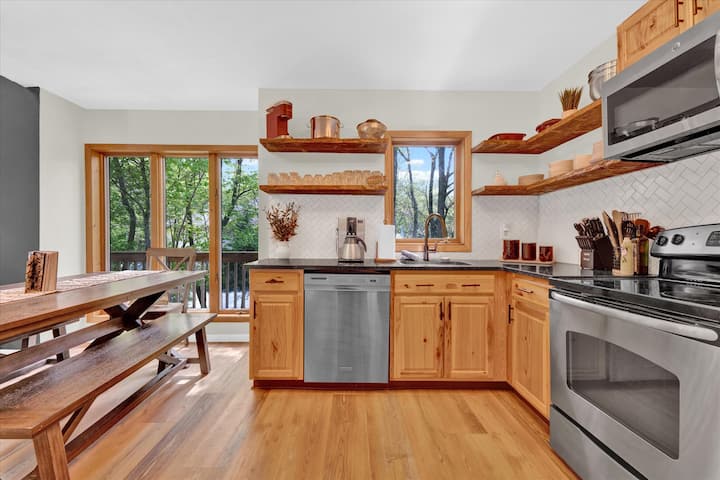 Добре оборудваната кухня разполага с всичко необходимо, включително блендер, прибори за печене, саксия, кафемашини Keurig и Mr. Coffee, както и френска преса. За ваше удобство има достатъчно място в килера и шкафа. Кухненската маса е удобна за настаняване на до 10 души, идеална за споделени ястия с гостите ви.