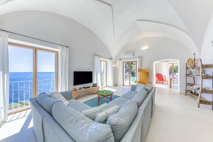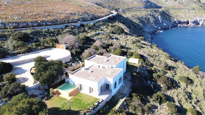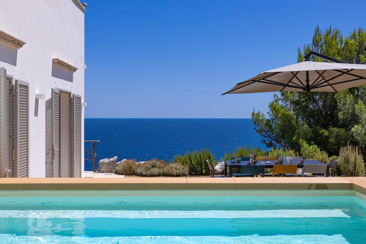 Тази апулийска вила е построена в традиционния стил на варосани, плоски къщи, но не спестява лукс. Големите прозорци от пода до тавана, с тройно остъкляване за ваш комфорт, предлагат зашеметяваща гледка към морето и неговите постоянно променящи се сини нюанси през целия ден и сезоните. Вилата разполага с четири напълно климатизирани спални (три двойни стаи, една единична стая), четири модерни бани с душове, просторна всекидневна и трапезария и напълно оборудвана кухня. Ще намерите и тоалетна за гости и перално помещение с пералня. Излезте навън в частично засенчената градина, оборудвана с външна маса за хранене, столове, шезлонги и самостоятелен басейн (приблизително 6 x 5 м). Целият имот е изключително достъпен за вас, осигурявайки максимално уединение и комфорт .