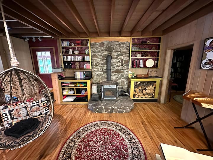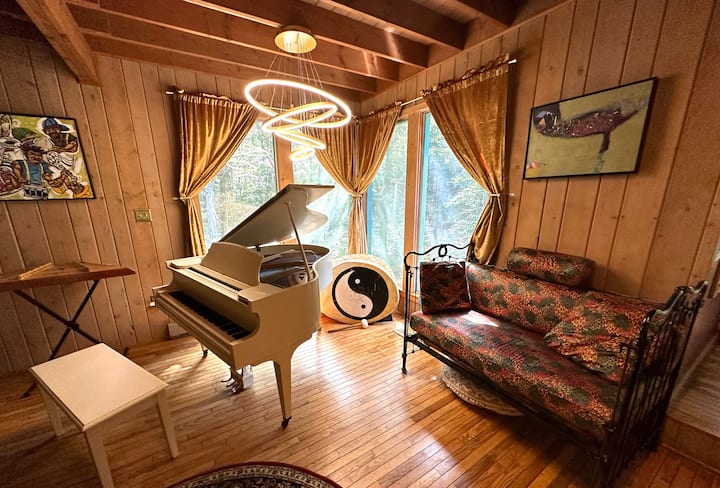 Това е музикален дом с много инструменти. Приветстваме ви да свирите и да откриете тези звуци, включително колекция от пеещи купи, електронен комплект за барабани, организми Farfisa и Hammond, акустични и електрически гитари, акордеон, индийски таблас, африкански говорещи и цепени барабани, както и много забавни и екзотични перкусионни инструменти. (Молим гостите да се отнасят към всички музикални инструменти с любов и грижа.)
