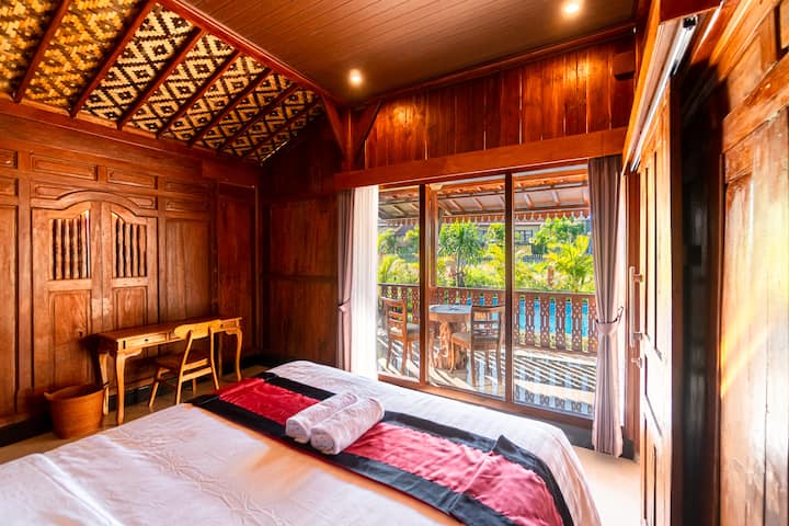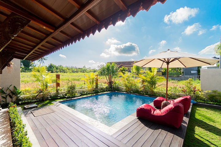 Идеална за малки семейства или групи, вилата разполага с две климатизирани спални, напълно оборудвана кухня и просторни вътрешни и външни пространства, за да направи престоя ви безпроблемен. Отвореното жилищно пространство ви кани да се отпуснете, докато се потапяте в естествения бриз и зашеметяващите гледки към оризището.