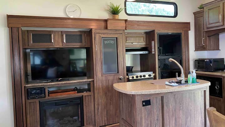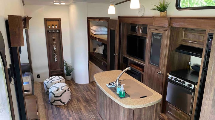Разполагаме с просторно колело с 2 спални 38 фута, което може да побере до 9 души с отворено оформление, огромни прозорци и високи тавани, които ви карат да се чувствате като в огромна къща.