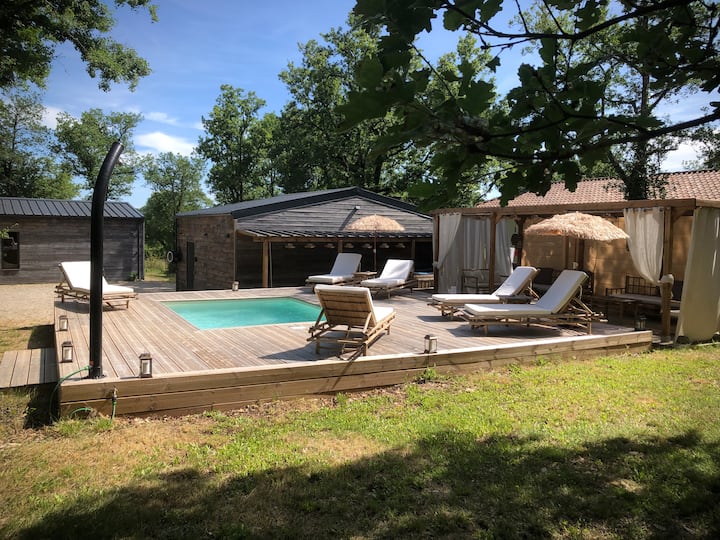 Къща с дървена тераса и басейн