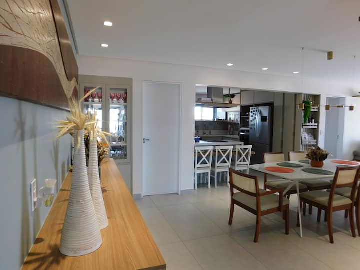Всичко беше направено с голяма обич и планирано в детайли. О, и знаете ли защо нарекохме апартамента „Травертино “? Тъй като изпълнихме мечтата да покрием основните стени на всекидневните и вечерята с бразилски травертинови мраморни тухли, естествен и красив камък, който донесохме директно от Еспирито Санто.
