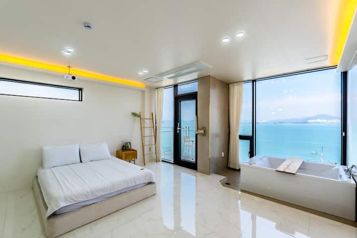 Суит СПА302 с тераса и красив интериор с изглед към океана в Йосу