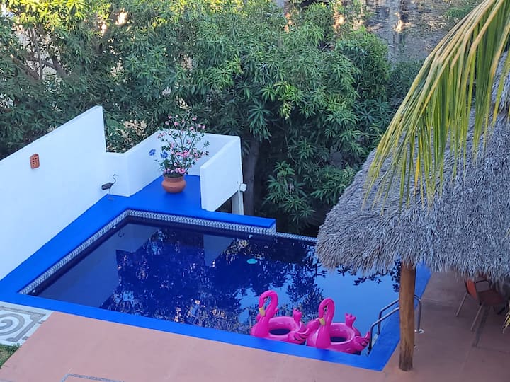 Тази вила е част от красив, уединен курорт с общо 3 вили, със споделен достъп до прекрасен басейн🏊♂️, вътрешен двор край басейна🌞, зона за барбекю🍖 и голямо покрито пространство, идеално за хранене🍽️ или просто за релаксация. Ще намерите много шезлонги, столове и маси, за да се отпуснете с групата си.