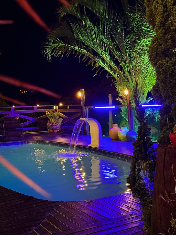 Нашето помещение се състои от Bangalôs Luxo, Chales и Bangalô, всички самостоятелни със спа баня, климатик, кухня. Разполагаме с външна зона с повече от 500 м², с басейн, паркинг , градина, барбекю, палуби.