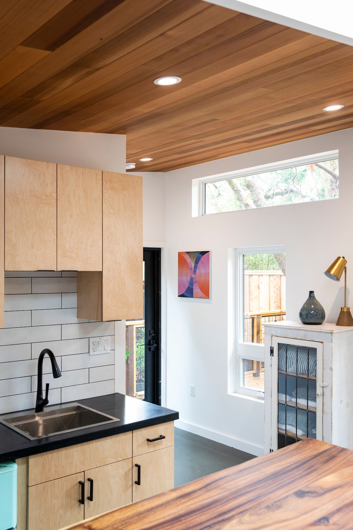 Cabaña е самостоятелен апартамент с площ 325 квадратни фута с баня и кухненски бокс, разположен в нашия просторен преден двор с отделен вход за нашите гости. Идеален е за 1 -2 пътници. Има самостоятелен вътрешен двор, който при топло време разширява пространството. Напълно пребоядисах интериора и ремонтирах с всички нови мебели. Има ново легло и нов плюшен твърд матрак, нови завеси и щори на прозорците, нови лампи, кожени столове, хладилник, микровълнова печка и тостер.