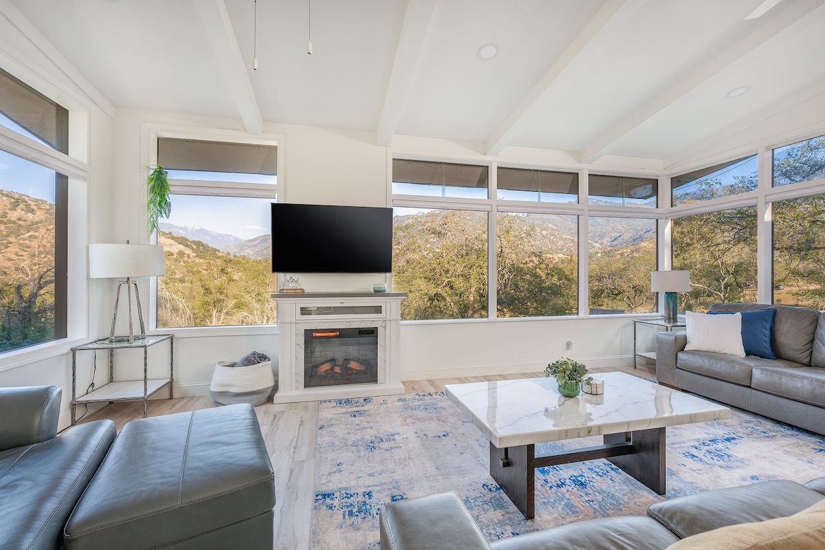 Отдъхнете си в частно убежище на върха на хълм със спиращи дъха планински залези. Отпуснете се в хидромасажната вана, разпуснете на живописните тераси с люлки и хамаци и се възстановете в красиво проектиран дом от средата на миналия век. Идеално за семейства и групи. Само на 15 минути от Национален парк „Секвоя“ и на 5 минути от езерото Кауиа. Зарядното устройство за електрически превозни средства е тип 14-50 и е лесно достъпно.